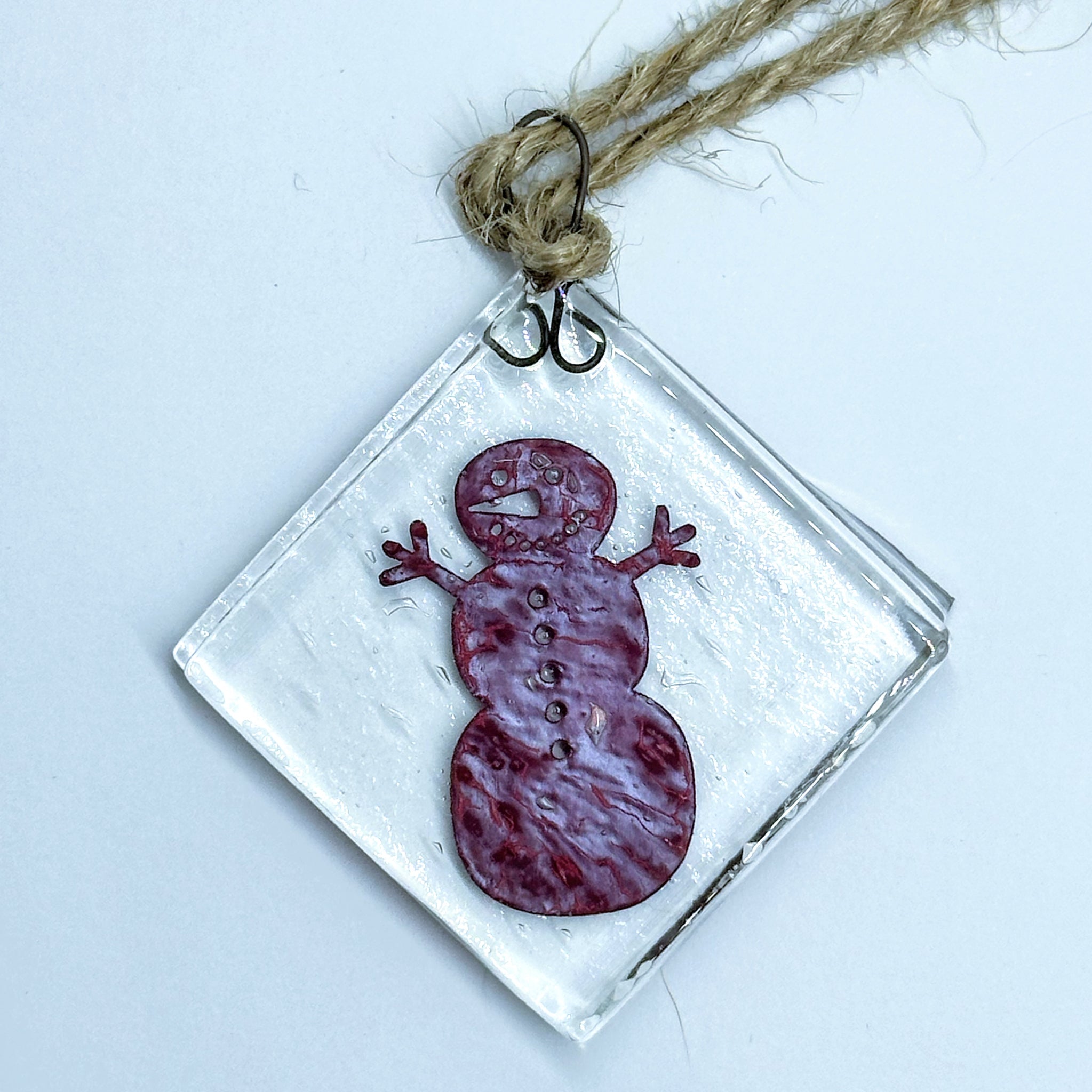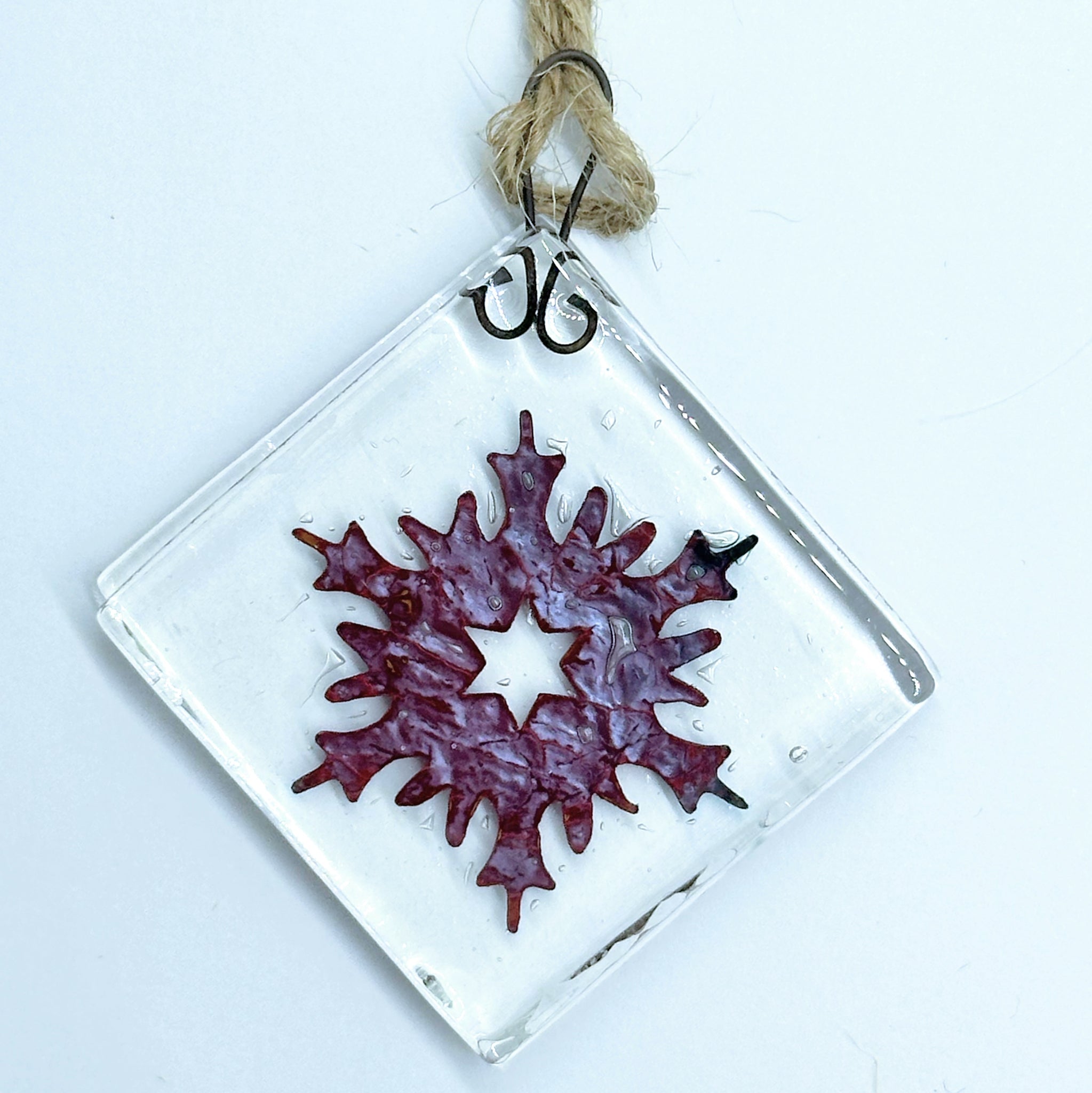 Hand cut glass decorations with unique copper foil designs to decorate your Christmas tree. Ready to hang with a twine tie attached.